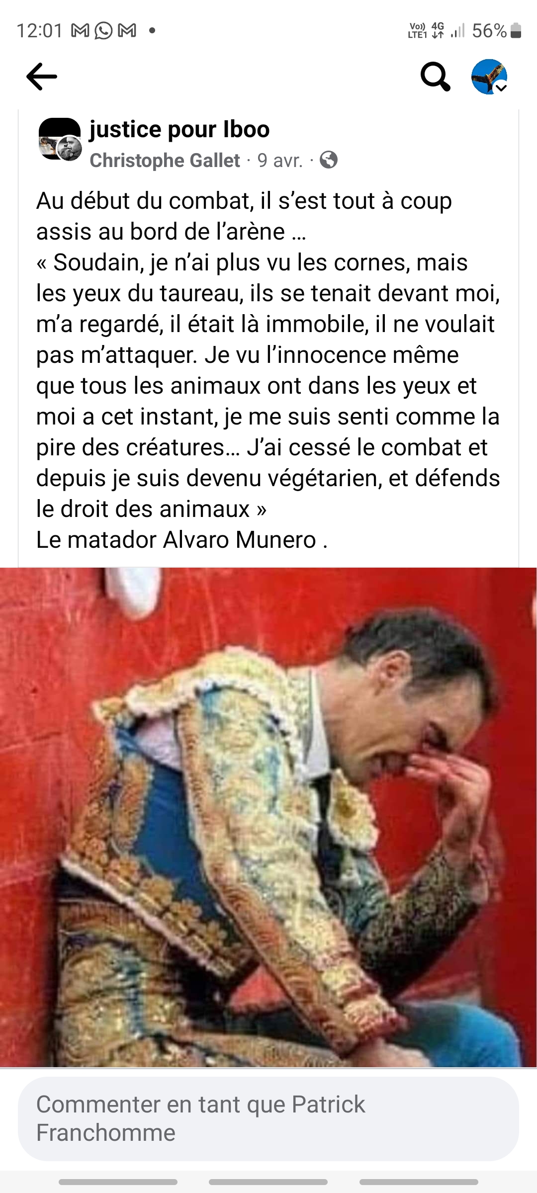 En 2024, un post FB relayé par LaCris a relaté l'histoire réelle d'un torero repenti.